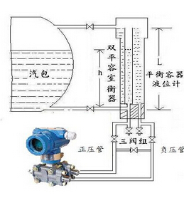 2.系統(tǒng)工作時(鍋爐汽有液位):在確保正負(fù)壓室充滿冷凝水的前提下,關(guān)閉平衡閥,打開正負(fù)相閥,同時關(guān)閉雙室平衡容器的汽液相閥門.