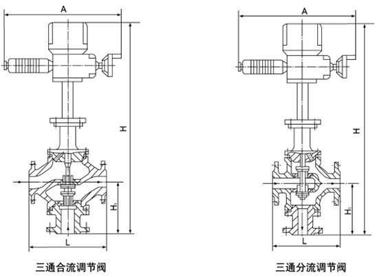 A brief introduction: ZAZQ, ZAZX seriesElectric three confluence, shunt valveThe cylinder shaped valve type thin window guide.With DKZ straight travel electric actuator, take 0 ~ 10 or 4 ~ 20mA.DC signal to drive the valve opening and closing.The three confluence valve for two kinds of fluid mixed into a three fluid, or different temperature of the same fluid, mixed into the same temperature fluid.Three shunt valve will be a fluid into two fluid. ZAZQ, ZAZX seriesElectric three confluence, shunt valveThe caliber of the product from 25mm to 200mm, nominal pressure 1, 1.6, 4, 6.4MPa, temperature range of -60 to 450 DEG C, the control signal is 0~10 or 4 ~ 20mA.DC.With different actuators can be divided into common type and the electronic type two. Two, work principle: ZAZQ, ZAZX seriesElectric three confluence, shunt valveComposed of DKZ electric actuator and three confluence or three shunt valve, with power supply as power, accept the standard signal, 0 ~ 10mA or 4 ~ DC 20mA DC drives the valve opening and the corresponding operation signal.The confluence of valve is the role of the two kinds of the three kinds of fluid exchange synthetic fluid, a fluid diverter valve is divided into two fluid.Shunt valve can only be selected corresponding confluence, but when DN = 80, the mixing valve can be used for streaming applications.Can replace two single seat control valve, saving investment, small occupied space.Three valve commonly used in two kinds of medium heat exchanger regulation ratio and simple adjustment. Three,Electric three confluence, shunt valveThe main features: 1, the fluid in flow state on the spool direction, so the working stability is good. 2, in addition to the valve cover at the guide bushing, the spool side and the valve seat surface also has a guiding role, oriented area, reliable work. 3, servo amplifier with depth dynamic negative feedback, can improve the accuracy of regulation. 4, electric operation in various forms, can be applied to 4 ~ 20mA.DC or 0 ~ 10mA.DC. 5, the electronic type electric control valve control valve opening directly from the current signal without servo amplifier. 6, automatic save investment, compared with single, double seat or sleeve valve, composed of the same system can dispense with a valve, simplifying the system, saving investment. 7, bellows seal type to form a complete seal for moving the valve stem, fluid leakage blocking must. Four,Electric three confluence, shunt valveThe main parts of the data: 1, valve body, valve cover: HT200, ZG230 ~ 450ZG1Cr18Ni9Ti; 2, valve, valve seat: 1Cr18Ni9Ti surfacing division Stellite alloys; 3, packing: ptfe; 4, a push rod, Bush: 2Cr13. Fifth, connection size and standard: 1, standard: flange cast iron flanges GB4216.5-84 steel flanges GB9113-88, JB/T79-94; 2, flange sealing surface: PN10, PN16 PN40, PN64 convex concave and convex, concave body; 3, the length of the structure: GB12221-89; 4, insulation jacket type jacket heat carrier interface: 18X4 diameter welding; 5, the valve flange and the flange end face distance can be manufactured according to user specified standards.Such as ANSI, JIS, JPI and other standards. Six, the main technical parameters: